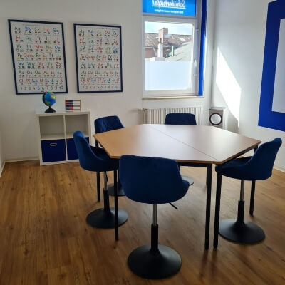 Um für unsere Schüler eine adäquate Lernumgebung zu schaffen, ist eine lernfördernde Raumausstattung für uns sehr wichtig. Für die Einrichtung haben wir uns für ein sehr modernes, freundliches und hochwertiges Inventar entschieden. Die Stühle für unsere Schüler sind beispielsweise alle höhenverstellbar und bieten einen angenehmen Sitzkomfort.