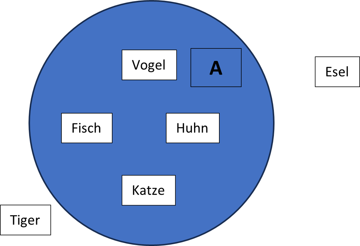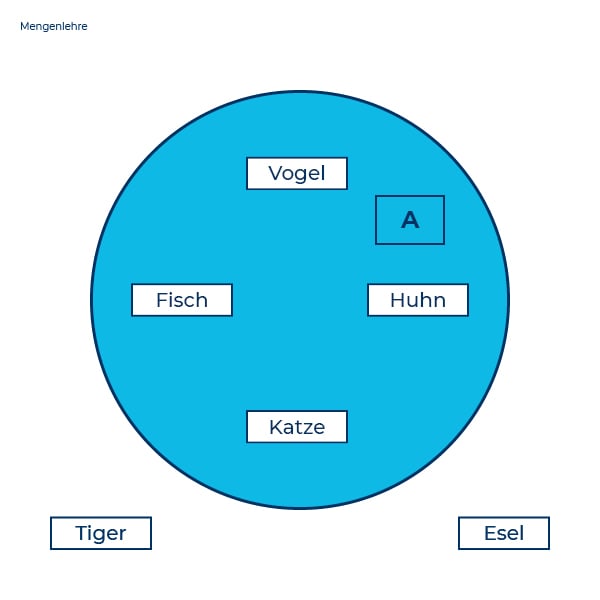 Hier siehst du eine Menge A. Wir haben sie durch einen blauen Kreis bildlich dargestellt. In der Menge befinden sich verschiedene Elemente, zum Beispiel Vogel und Fisch. Aber Vorsicht: Nur weil alle Begriffe hier Tiere sind, heißt das nicht, dass sie alle zur Menge gehören. Die Elemente Esel und Tiger liegen außerhalb der Menge. Man sagt auch: Sie sind nicht Teil der Menge A.