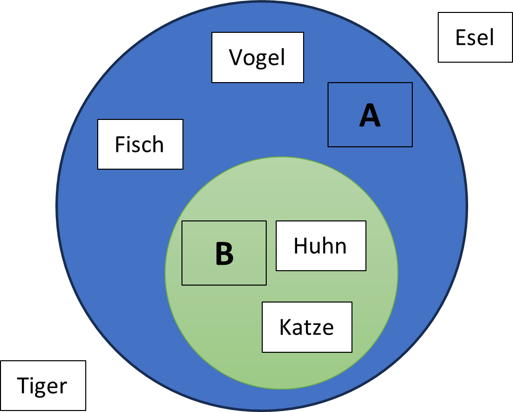 Hier siehst du wie vorher die Menge A. Die Menge A enthält vier Elemente: Vogel, Fisch, Huhn und Katze. Sie enthält außerdem die Teilmenge B. Die Teilmenge B enthält auch Elemente, aber nur zwei: Huhn und Katze. B ist eine Teilmenge von A. Umgekehrt kannst du sagen: A ist die Obermenge von B.