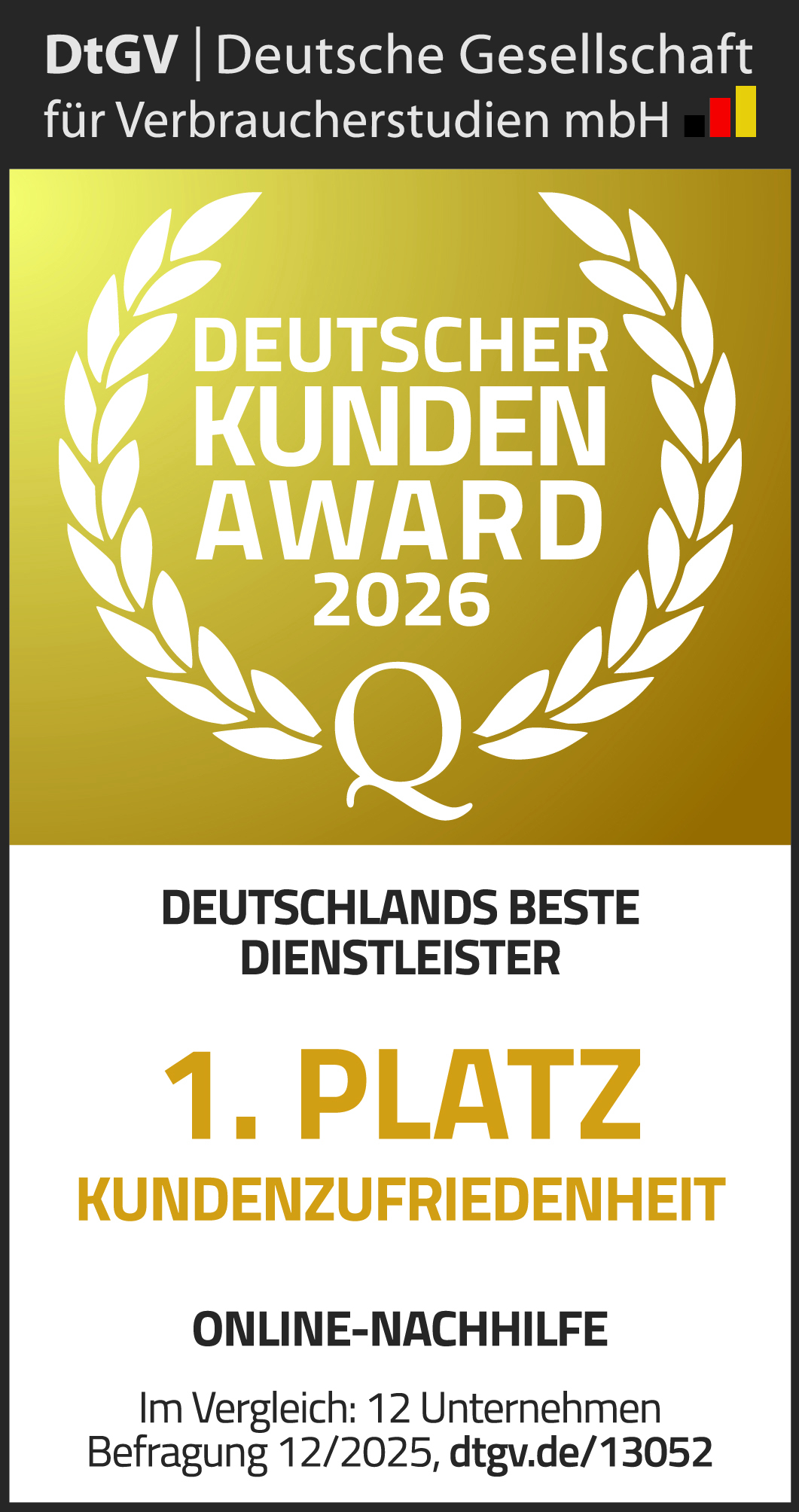 Deutschlands Profi-Nachhilfe Nr. 1 / Testsieger / von zufriedenen Eltern empfohlen: Testsieger der Studie „Von Kunden empfohlen“, DEUTSCHLAND TEST/ServiceValue 2025, Testsieger der ntv-Studie 2025 „Service und die Leistung von Nachhilfeinstituten“ und Testsieger der Studie "Deutschlands beste Dienstleister 2026" in der Branche "Online-Nachhilfe" in der Kategorie "Kundenzufriedenheit".