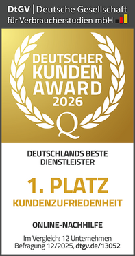 Deutschlands Profi-Nachhilfe Nr. 1 / Testsieger: Testsieger der Studie „Von Kunden empfohlen“, DEUTSCHLAND TEST/ServiceValue 2024, in der Branche „Nachhilfeanbieter" ,Platz 1 / Testsieger der ntv-Studie 2023 „Service und die Leistung von Nachhilfeinstituten“ vom Deutsche Institut für Service-Qualität und Platz 1 / Testsieger der Studie "Deutschlands beste Dienstleister 2024" in der Branche "Online-Nachhilfe" in der Kategorie "Kundenzufriedenheit".